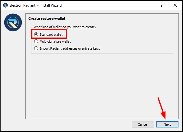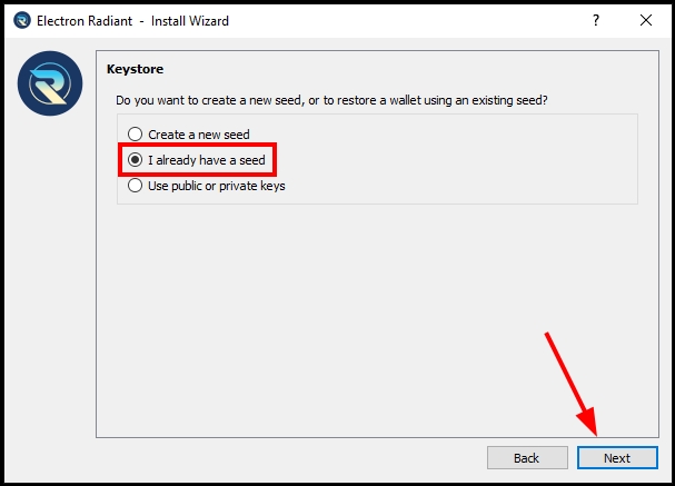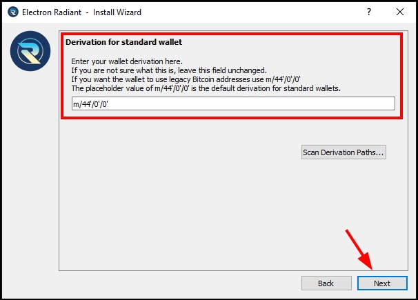 Specify the derivation of the addresses. If it has not been changed, leave the default with: m/44'/0'/0'