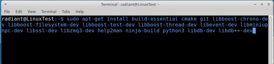 sudo apt-get install build-essential cmake git libboost-chrono-dev libboost-filesystem-dev libboost-test-dev libboost-thread-dev libevent-dev libminiupnpc-dev libssl-dev libzmq3-dev help2man ninja-build python3 libdb-dev libdb++-dev