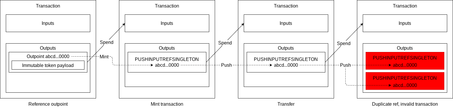 As seen in the diagram above, an outpoint in the first transaction is used to create a singleton ref. The referenced output also contains an "immutable token payload" which can be stored as a push data. This is a simple way of associating data with our token, where the token data can be fetched from the referenced output. The payload could be an image or more complex data structure. Token UTXOs are kept light weight by not carrying the payload.