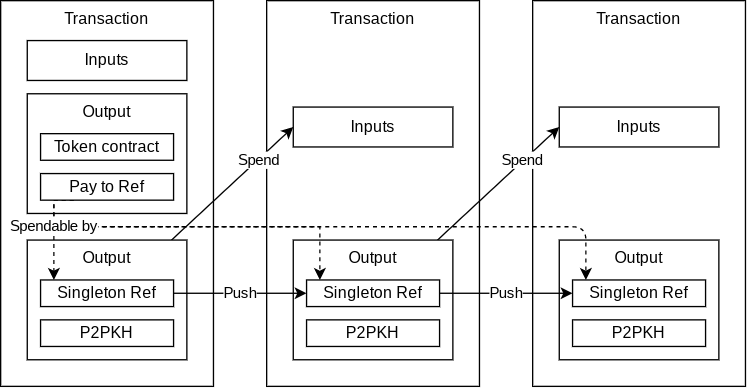 We can now handle token transfers using only the P2PKH output and not have to touch the rest of the contract. Since the token contract doesn't contain the P2PKH script, only a pay to ref, it is automatically carried forward with the transfer. For wallets to support transfers of this token, they only need to handle a simple singleton + P2PKH script and not be concerned with custom functionality or parsing custom contract templates.