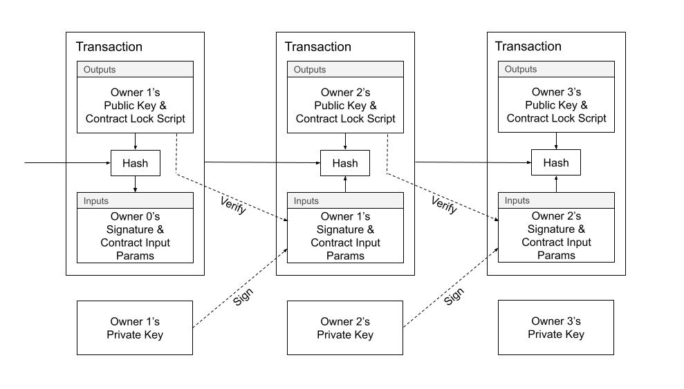Similar to Bitcoin, we define an electronic coin as a chain of digital signatures. Where transactions in Radiant differ is that each owner transfers the coin to the next by digitally signing a hash of the previous transaction in addition to the required input params to unlock the coin. A transaction also creates new output locking constraints, which may include the public key of the next owner, amongst any other rules defined by the user.