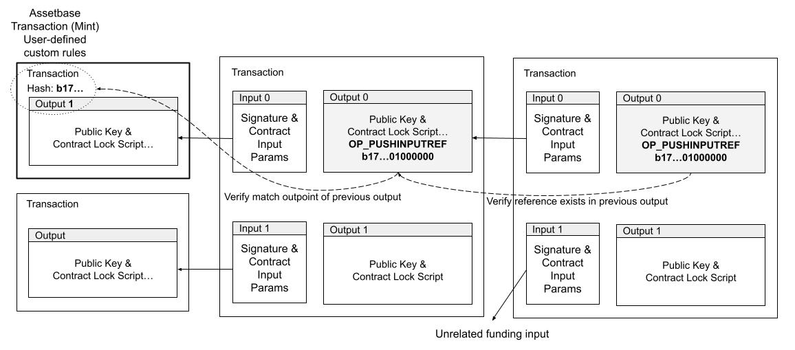 A programming instruction, called OP_PUSHINPUTREF, is used to attach a reference to an output. The instruction accepts exactly one 36-byte parameter which must match either 1) the outpoint of one of the outputs being spent, or 2) the same 36-byte value already appears in a previously specified OP_PUSHINPUTREF in one of the outputs being spent. The only way for any given value to appear in a transaction output is that, through some ancestor transaction, it matched the outpoint from the initial minting assetbase transaction. Transactions that specify a value which do not meet either condition are invalid.