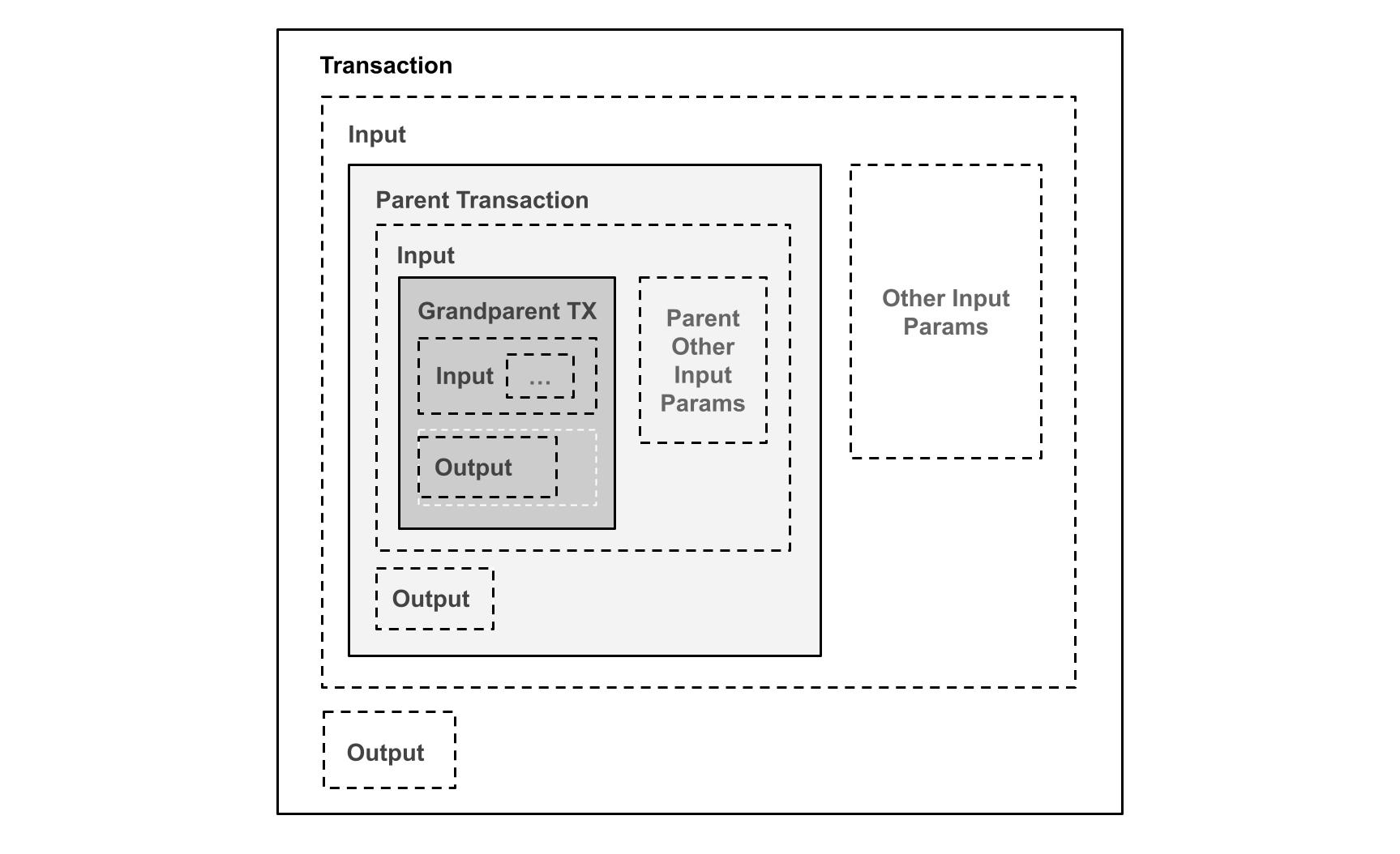 Diagram 6. Full parent transaction validation, mathematical induction proof by embedding the full parent transactions into the inputs resulting in exponential transaction size increase.\