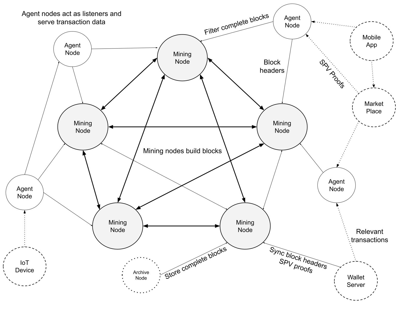 Diagram 8. Mining Nodes are well-connected and build on top of each other's blocks. Archive nodes store complete blocks for historical analysis and bootstrapping purposes. Agent nodes are listener nodes which filter and store transactions to serve clients.\